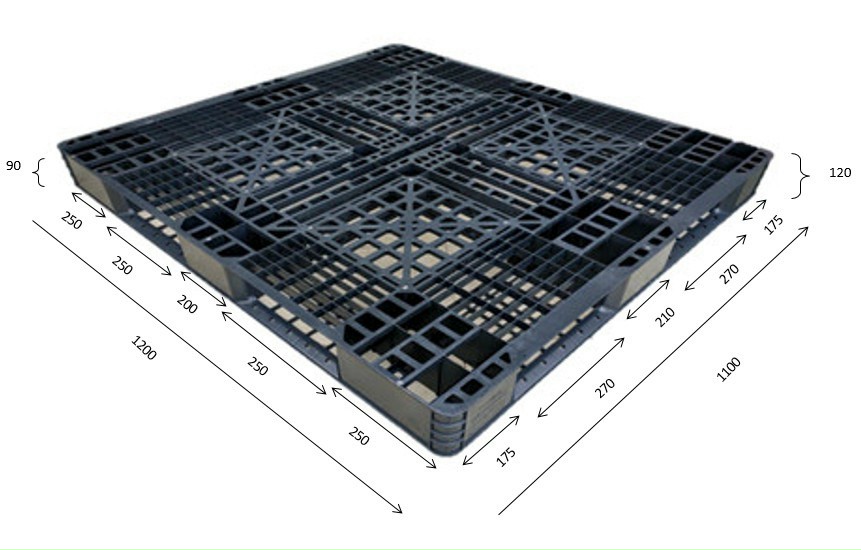 Pallet nhựa 1200x1100x120mm chuyên dùng để kê hàng, xuất khẩu, nâng hạ hàng hóa, lót sàn trong kho lạnh hoặc thùng xe, lưu trữ hàng hóa tại kho bãi,chống tĩnh điện, chống ẩm mốc và ngập úng trong kho hàng.